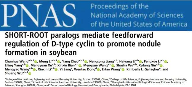 2022年1月13日,该成果以“SHORT-ROOT paralogs mediate feedforward regulation of D-type cyclin to promote nodule formation in soybean” 为题发表在国际权威学术期刊《Proc Natl Acad Sci U S A》,开云网页版为第一完成单位,开云网页版园艺学院博士后王春华、博士生李梦、科研助理赵阳为论文第一作者,吴双教授为通讯作者,研究得到了国家重点研发计划(2016YFD0100700, 2018YFD1000800)和国家自然科学基金(31722006)的资助。