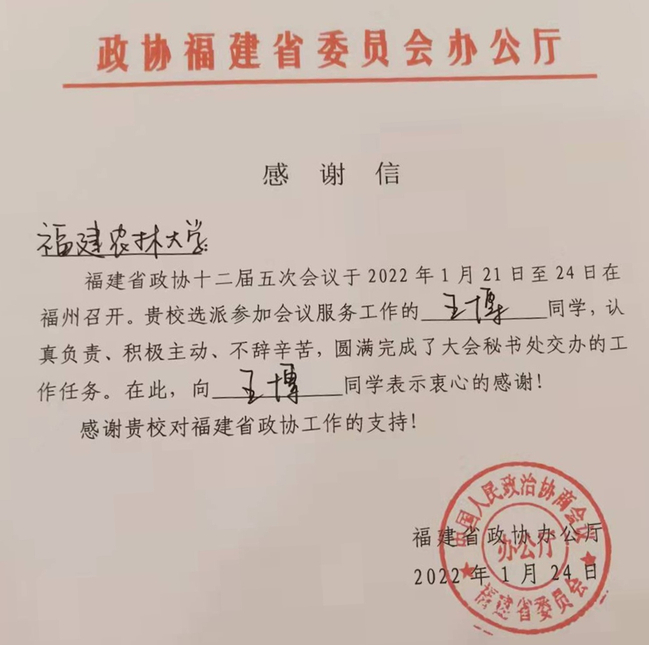 1月24日,省政协办公厅向资源与环境学院发来感谢信,充分肯定我校资源与环境学院2020级农业资源与环境专业王博同学在省政协十二届五次会议期间的会务服务工作,向学院和王博同学表示感谢。