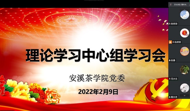 2月9日下午,安溪茶学院党委通过线上腾讯会议形式召开理论学习中心组学习会,专题学习校党委书记王建南的署名文章《“弱鸟先飞”与“滴水穿石”——论加快建设高水平大学的行动自觉》,学院党委书记连文主持会议,理论中心组成员参加学习。