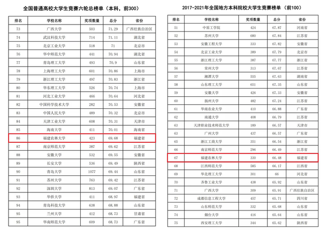 近日,中国高等教育学会发布2021全国普通高校大学生竞赛分析报告。在《全国普通高校大学生竞赛六轮总榜单》中,我校位列第86位,居全国农林类高校第三,福建省属高校第二;在《2017-2021年全国地方本科院校大学生竞赛榜单》中位列第67位。