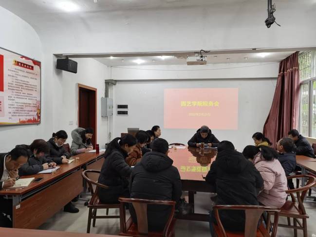 2月22-23日,园艺学院分别召开党委会、学院中层干部会议,贯彻落实学校新学期工作会议精神,部署安排学院新学期工作。会议强调,学院师生要把思想和行动统一到学校党委决策部署上来,围绕“八个突出”,发扬“弱鸟先飞、滴水穿石”、“人一我十”的精神,巩固学院党史学习教育成果,推进学院党建和思政工作守正创新“八大工程”建设,把坚定理想信念落实到具体工作中,在学科建设、学术研究、教学管理、人才培养、社会服务等方面进行提质增效,以实际行动和优异成绩迎接党的二十大胜利召开。