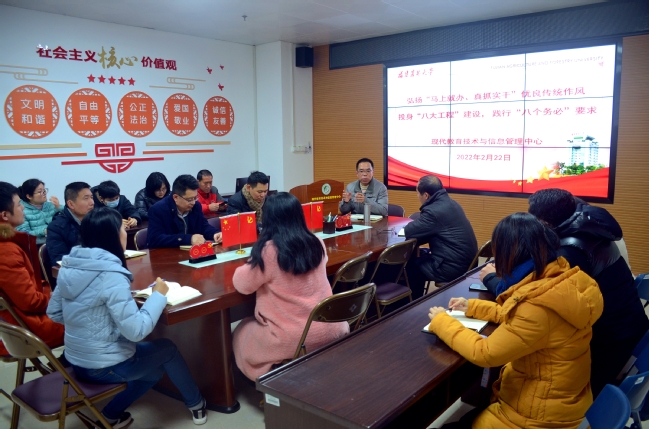 2月22日,现代教育技术与信息管理中心召开会议,传达学习学校新学期工作会议精神,对新学期重点工作进行部署。会议指出,要以实施“提高效率、提升效能、提增效益”行动投身“八大工程”建设, 践行“八个务必”要求。一要提高政治站位。深入学习贯彻党的十九届六中全会精神和省第十一次党代会精神,深刻认识“两个确立”的决定性意义,认真学习贯彻习近平总书记关于教育的重要论述,把思想与认识统一到中央决策部署、省委工作要求和学校党委行政部署任务上来,着力以“八大工程”为统领,以教育信息化推动教育高质量发展。二要加强作风建设。认真践行“八个务必”,坚持“一线工作法”,发扬“马上就办、真抓实干”的优良作风,“弱鸟先飞”的求变精神,“滴水穿石”的奋斗精神,主动作为,踔厉奋发,攻坚克难,紧密结合当前学校信息化建设实际,从最突出的问题入手,抓住重点、抓紧行动,细化任务、对标对表。三要做到“四个提升”。高起点谋划2022年网络和信息化建设重点任务,围绕网络安全、基础网络、信息服务、教学环境等教育新基建重点方向进行发力,加快推动智慧校园建设。