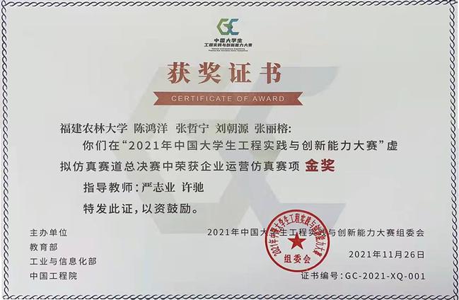 项目简介:中国大学生工程实践与创新能力大赛由教育部、工业与信息化部以及中国工程院主办,旨在鼓励大学生将所学专业知识运用于实践之中,培养大学生创新意识、创业意识和团队意识。我校团队参加的企业运营仿真赛项,重点围绕“产教融合”“商工结合”“数智经济”等主题内容,通过模拟供应链上、下游企业业务流程与全景商业社会生态环境,是对学生经营和管理企业能力的一次全面比拼。我校团队充分发挥多年来在产教融合、虚拟仿真建设和复合应用型人才培养方面的优势,从来自全国各大高校的60支队参赛团队中脱颖而出,斩获金奖。