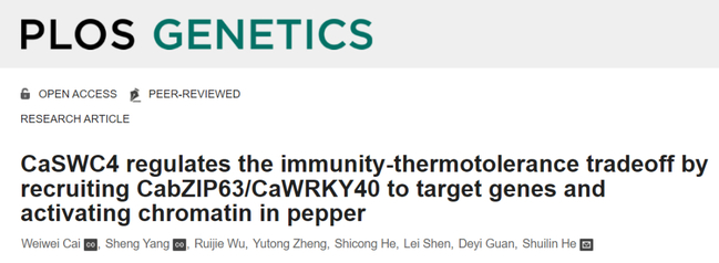 2022年2月28日,开云网页版应用遗传学高校重点实验室何水林教授团队在PLoS Genetics在线发表了题为CaSWC4 regulates the immunity-thermotolerance tradeoff by recruiting CabZIP63/CaWRKY40 to target genes and activating chromatin in pepper的研究论文。该研究发现参与表观遗传学调节的SWR1复合体的重要亚基SWC4在辣椒耐高温高湿逆境和抗青枯病中均起正调节作用,它通过直接互作并激活靶基因染色质从而将CabZIP63和CaWRKY40招募到它们的靶基因位点,以实施其在辣椒耐高温和抗青枯病中的正调节作用。