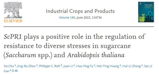 2022年3月7日,农林科学领域国际权威期刊Industrial Crops and Products在线发表了我校国家甘蔗工程技术研究中心高三基团队题为“ScPR1 plays a positive role in the regulation of resistance to diverse stresses in sugarcane (Saccharum spp.) and Arabidopsis thaliana” 的研究论文。该研究揭示了病程相关蛋白1基因ScPR1在甘蔗和转基因拟南芥上应答病原细菌和多种非生物胁迫过程中起重要作用。