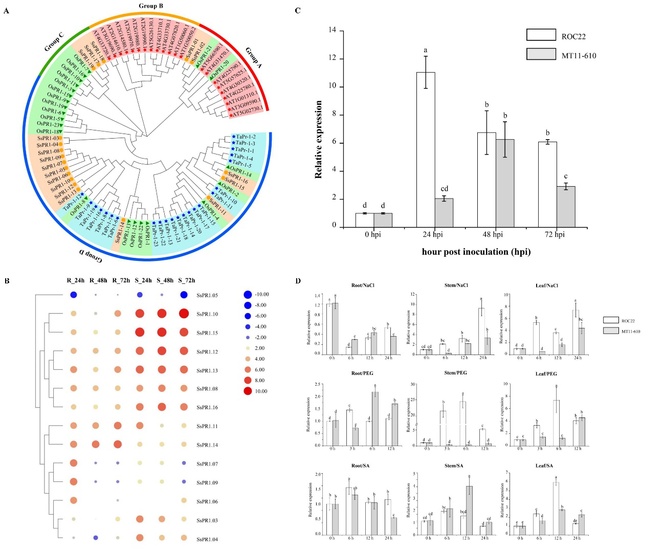 病程相关蛋白(pathogenesis related protein, PR)是植物受病原物侵染或非生物因子刺激后产生的一类水溶性蛋白。根据PR蛋白氨基酸序列和生物学功能划分为19个基因家族,其中PR1蛋白参与植物系统获得抗性(SAR)反应,并且常被作为SAR的标记基因。此外,PR1蛋白还参与植物的非生物胁迫响应,在植物生长或发育中也起着重要作用。有关甘蔗PR1蛋白基因家族成员及其在逆境胁迫中的功能和机制尚不清楚。该研究在甘蔗属割手密基因组上鉴定到19个PR1蛋白基因,基于系统进化分析划分为3个基因亚家族(图1A)。从甘蔗应答赤条病菌(Acidovorax avenae subsp. avenae)侵染的转录组中鉴定到14个ScPR1基因,转录组和聚类分析发现这些基因在抗病和感病品种上的转录表达模式差异明显,其中与割手密SsPR1.14同源基因(Cluster-13677.90901)在抗病上的转录表达水平显著高于感病品种(图1B)。从甘蔗抗病品种新台糖22号上克隆获得该同源基因ScPR1,RT-qPCR验证其在甘蔗赤条病菌、NaCl、PEG6000和水杨酸(SA)胁迫下表达量显著提升(图1C-D)。