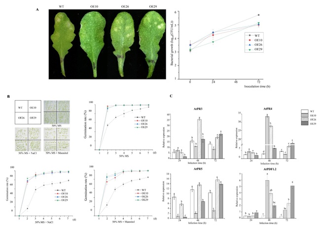 此外,过表达ScPR1基因的拟南芥转基因株系对丁香假单胞杆菌番茄致病变种菌株DC3000、NaCl和甘露醇胁迫的耐受性显著增强(图2A-B)。在病原细菌侵染的过程中,SA和JA/ET信号途径中的相关防御基因PR3、PR4、PR5和PDF1.2的转录表达也显著上调(图2C)。综上,该研究解析了甘蔗ScPR1基因在逆境胁迫响应中的分子功能,为甘蔗育种提供重要的抗性基因资源,有望在甘蔗抗逆遗传改良上得到应用。