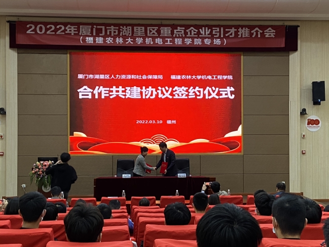 3月10日下午,机电工程学院与厦门市湖里区人力资源和社会保障局合作协议签约仪式暨湖里区重点企业引才推介会在旗山小报告厅举行。厦门市湖里区人力资源和社会保障局副局长郭琦玮、就业中心主任林来付、人才服务中心主任万兴学,学院党委副书记曹滨斌、团委书记叶善斌、毕业班辅导员、企业及部分2022届毕业生代表参加活动。