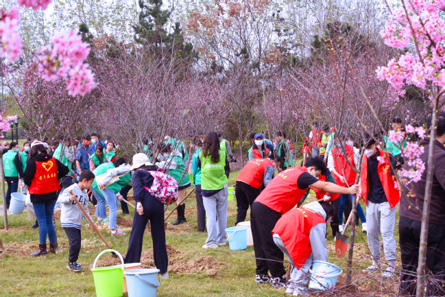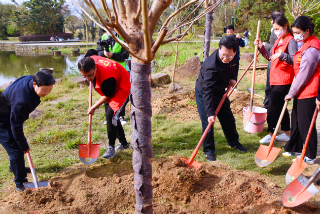 上午九时,副校长林庆藩主持植树节启动仪式,王建南、兰思仁等全体校领导带领师生150多人分别在中华名特优植物园、北区常盛会议中心携手种下3棵凤凰木、200棵梅花、20棵茶花,用绿意和花香扮靓校园,迎接党的二十大的召开。植树现场一派热火朝天的忙碌景象,校领导同师生代表一起扶苗培土、拎桶浇水,气氛热烈。