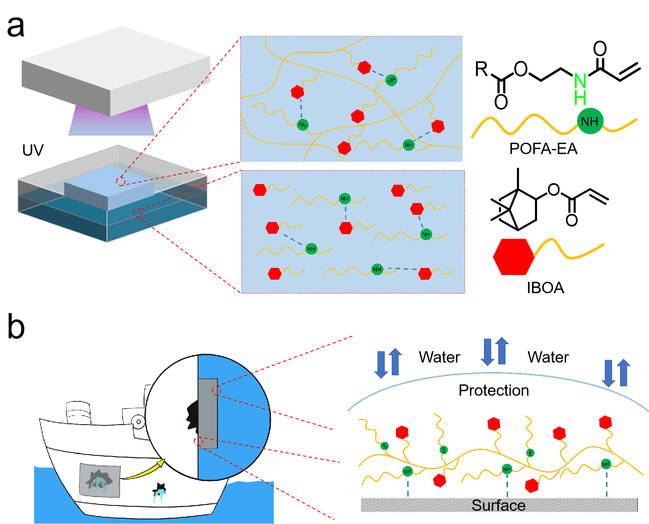 图1 棕榈油基水下胶黏剂的设计原理(a)POFA-EA/IBOA树脂紫外光固化机理;(b)胶黏剂胶接及防水机理