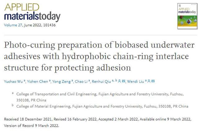 水下胶黏剂是指能在水中维持高粘结强度的一类胶黏剂,在生物医学和工程领域应用广泛,但这类胶黏剂使用场合要求高,制备高性能的耐水胶黏剂仍是一大挑战,尤其是胶带型胶黏剂,要求在与基材表面接触时能快速去除表面水分,并与基材形成牢固的粘结作用力,且在水中能保持胶接强度不受破坏。
