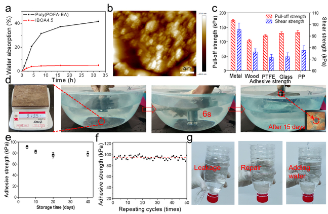 图2 棕榈油基水下胶黏剂的结构与性能(a)树脂吸水性对比;(b)胶黏剂原子力显微照片;(c)对不同基材的胶接强度;(d)胶接金属15天后情形;(e)随时间变化的胶接强度;(f)胶黏剂重复使用后的强度;(g)封堵漏水