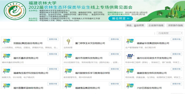 本次线上专场供需见面会为期一个多月,吸引了中粮面业有限公司、福建天马科技集团股份有限公司、内蒙古伊利实业集团股份有限公司、三棵树涂料股份有限公司、江西正邦作物保护股份有限公司、福建圣农食品有限公司、福建雪品集团有限公司、嘉园环保有限公司、广电计量检测(福州)有限公福州城建设计研究院有限公司、福州金域医学检验所有限公司等百余家企业参加。参会企业为毕业生提供需求岗位近2500个,涵盖了农林类、生物类、环保类、管理类、教育类等各领域就业岗位。