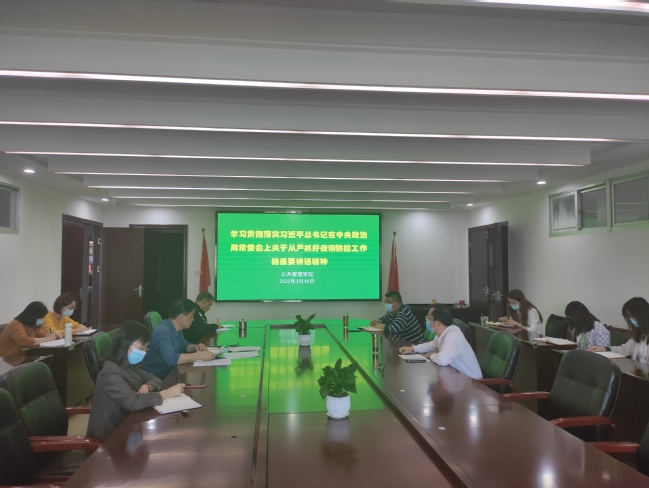 3月18日,公共管理学院党委书记曾起郁主持召开党委(扩大)会议传达学习3月17日习近平总书记在中央政治局常委会上关于从严抓好疫情防控工作的重要讲话精神,传达校党委关于疫情防控的最新要求,部署学院疫情防控有关工作,学院党委班子成员、科级干部、辅导员参加会议。