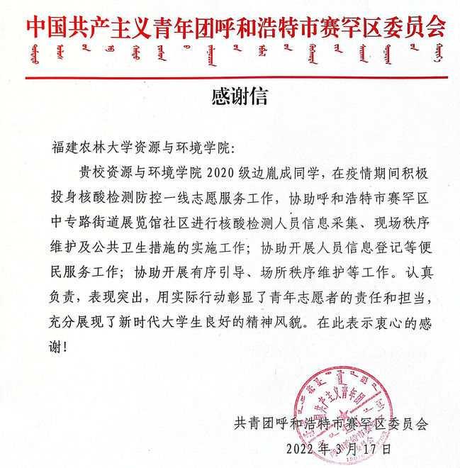 近日,中国共产主义青年团呼和浩特市赛罕区委员会向资源与环境学院发来感谢信,信中对学院2020级农业资源与环境专业边胤成同学在当地疫情防控志愿服务工作中的表现予以充分肯定,向学院表示感谢。