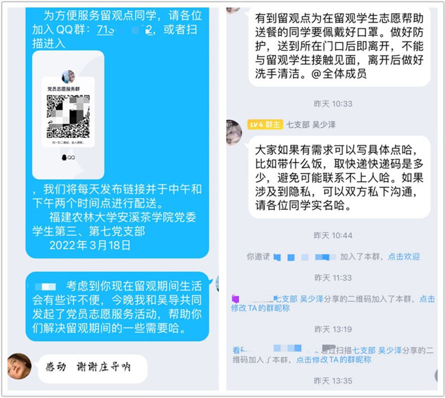支部党员通过线上方式组建党员志愿服务群,建立党员志愿者和健康监测同学的互助联系。为保证志愿服务活动顺利开展,志愿者每日于党员志愿服务QQ群中定时发送腾讯文档链接,由健康监测同学在当天填写次日所需物品和送达地点,由党员志愿者在群内回复收取任务。每日晚上在群里截图公示,便于次日开展一对一帮扶行动。
