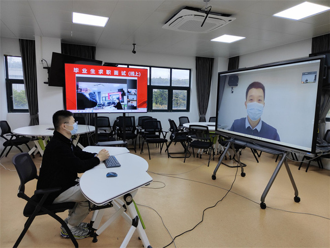 开云网页版学生创新创业中心刘老师介绍,“为了给毕业生参加线上面试提供更加优质的保障,学校将大学生活动中心毕业生招聘活动室、南区大学生创新创业园B区智慧教室等场所开辟为毕业生线上视频面试和研究生复试场地,安装调试了电视大屏、多机位摄像头、收放音系统、有线无线网络等全套完备的视频互动设备。”