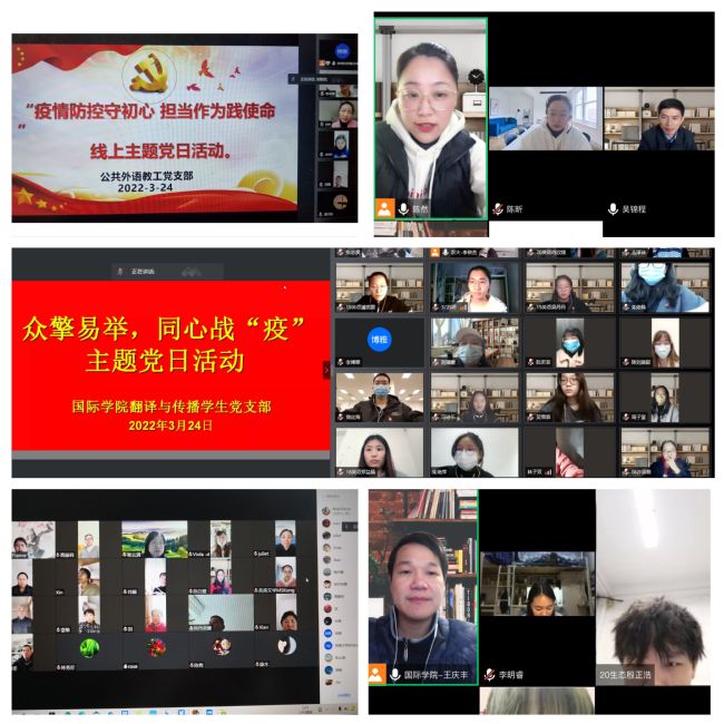 3月23日-24日,国际学院党委5个师生党支部相继开展“疫情防控守初心,担当作为践使命”“众擎易举,同心战‘疫’”等线上主题党日活动,深入学习贯彻习近平总书记关于疫情防控工作的重要讲话和重要指示批示精神,不折不扣落实省委和校党委疫情防控工作会议精神,结合当前疫情防控形势及工作实际,充分发挥基层党组织的战斗堡垒作用和共产党员的先锋模范作用,让党旗在疫情防控一线高高飘扬。