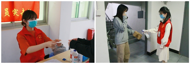 党团员突击队志愿服务值班岗。经济管理学院团委学生会于东苑宿舍区设立党员突击队、团员突击队志愿服务岗实现学院宿舍区每层楼志愿服务岗全覆盖,对出入宿舍楼同学们进行体温检测、口罩佩戴提醒、一次性口罩提供、快递二次消杀以及防疫规定宣传等工作。