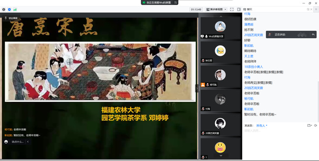 “茶,‘兴于唐,盛于宋,始为世重矣’。从唐中后期开始,茶在人们生活中所占的地位日益重要,至有‘茶为食物,无异米盐’的说法。在宋代,全社会各阶层普遍饮茶,‘君子小人靡不嗜也,富贵贫贱靡不用也’。茶成为人们日常生活中不可或缺的物品之一……”邓婷婷生动有趣的授课方式激发了同学们对于中华茶文化的浓厚兴趣,同学们踊跃参与讨论老师提出的话题。