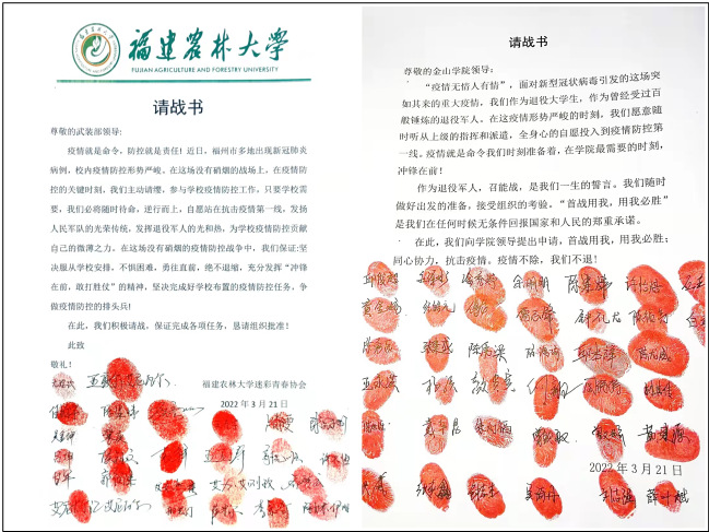 3月21日,开云网页版武装部收到了一封特殊的请战书,上面共有62个鲜红的手印,他们全部来自校退役大学生士兵协会迷彩青春协会,他们自愿投身到抗击疫情的志愿服务当中,争做疫情防控的排头兵,用实际行动践行“若有战,召必回”的铿锵誓言。他们心中的目标只有一个:牢牢守住校大门“第一道关口”,坚决夺取疫情防控阻击战的最终胜利。