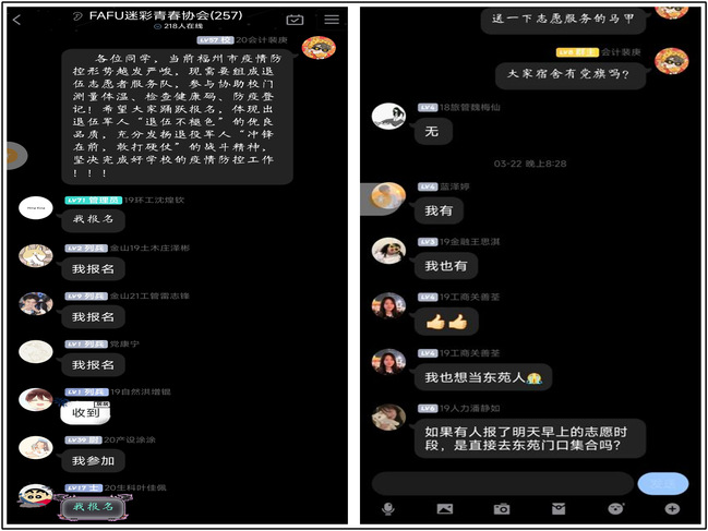 裴庚是经济管理学院会计学专业的学生,退役复学后,他担任了迷彩青春协会的副会长,组织队友配合武装部参加到校园安保、秩序维护、征兵宣传、新生军训等活动中。在得知武装部在疫情防控工作中需要志愿者后,他在线上积极组织发动协会会员参与志愿服务。让他感动的是,每一次发布召集信息,马上得到会员的积极响应,一个岗位同时有多人报名是常态,设立的党员先锋岗,也得到了学生党员的积极响应。志愿活动开展以来,累计招募退役大学生志愿者300多人次,开展志愿服务时长达900多小时。