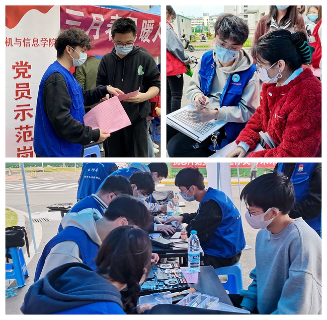 结合当前疫情防控形势,同学们做好了充分的准备,引导现场师生正确佩戴口罩并有序排队,大家分工明确,有的负责登记电脑故障信息,对电脑设备进行“预检分诊”;有的发挥专业优势,理论联系实际,结合工作经验快速有效地解决电脑系统卡顿、电脑蓝屏、电脑积灰等问题,为正在开展线上教学的师生们排除电脑故障,助力线上教学活动有序开展;有的为同学们讲解电子设备日常使用维护的注意事项,传授延长电子设备使用寿命的小诀窍;有的在普及宣传《2022年新冠肺炎疫情防控知识手册》等防疫知识,引导师生积极面对当前严峻复杂的疫情防控形势,全面筑牢校园安全屏障。