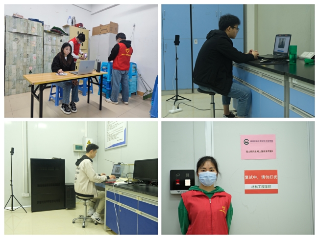 党员志愿者们为场地配备了笔记本电脑、手机支架、三脚架等常用工具,并调试了网线、WiFi,保障考试时网络不掉线;复试考场的门上张贴着“研究生网上复试专用区”、“研究生复试中,请勿扰!”等温馨提示;复试时,志愿者们耐心守护在场外,维持秩序,并随时准备应对各种突发情况。志愿者们的精心准备和暖心服务,为考研学子们打造了属于他们的“圆梦空间”。