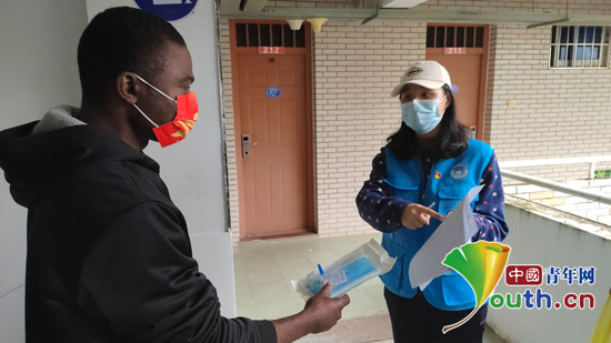 疫情防控党员突击队、“众擎‘疫’举”志愿服务队队员,2019级英语专业的刘靖童说,“留学生们身处异国他乡,语言上的障碍,使他们无法快速准确了解疫情动态,多少还是有些紧张,我们通过走访留学生宿舍,宣传疫情防控政策,发放防疫物资,将学校的关怀传递给他们,缓解他们的紧张情绪。”