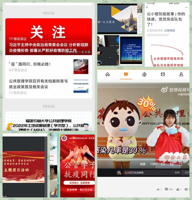 近期疫情发生以来,公共管理学院党委从严从紧从实贯彻落实校党委疫情防控部署和要求,坚持以立德树人为根本,制定完善《疫情防控期间开展“线上思政”系列活动方案》,不断完善“五个上线”网络思政工作机制,通过学院各类线上平台,推进“政治学习、专业拓展、防疫知识、文体活动、榜样事迹” “五个上线”,将党旗高扬在网络阵地上,在统筹疫情防控中推进落实校党委党建和思政守正创新“八大工程”,推动“三全育人”综合改革。