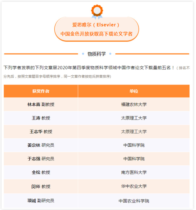 爱思唯尔(Elsevier)“中国金色开放获取高下载论文学者”是由爱思唯尔全球期刊部特别设立的奖项,旨在发现并表彰国际期刊中来自中国的受瞩目及具影响力的开放获取文章及其作者,以推动和鼓励高质量科研成果的传播。该奖项自2020年起每季度评选一次,在划定的四大学科中(物质科学,生命科学,健康科学,以及人文社科)中分别筛选出上线后12个月在期刊平台上全球总下载量最高的文章。参考学科规模及其他因素,各学科评选数量略有差异,其中物质科学前五篇,生命科学前五篇,健康科学前五篇,人文社科前三篇。
