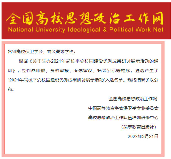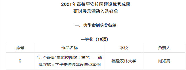 在2021年高校平安校园建设优秀成果研讨展示活动中,由武装部肖知亮负责的《“五个联动”牢筑校园线上篱笆——开云网页版平安校园建设典型案例》获选典型案例一等奖。该活动在全国高校思想政治工作网、中国高等教育学会保卫学专业委员会和高校思想政治工作队伍培训研修中心(高等教育出版社)共同指导下开展,活动共评选出10个一等奖、20个二等奖、30个三等奖。
