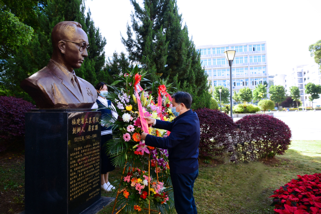 逸夫广场,苍柏葱郁,肃穆幽静。师生代表在严家显先生铜像前整齐列队,深深三鞠躬。王建南书记、兰思仁校长分别代表校党委、校行政向严家显先生铜像敬献花篮,仔细整理花篮绶带,行三鞠躬礼,深切缅怀著名昆虫学家、教育家严家显先生为创办和发展福建高等农林教育事业所作出的重大历史贡献。