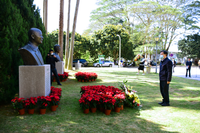 校长兰思仁代表学校向五位先贤铜像敬献花篮