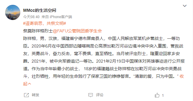 学习先烈事迹,汲取力量悟初心。公共管理学院团委组织学生在在微博平台发布话题#遥寄哀思,共祭文明#并附上要祭奠的革命烈士的生平、事迹、贡献和自己的感悟,在祭奠革命先烈的同时引导同学们对革命烈士的光辉事迹不朽精神进行深入了解,足不出户线上祭扫,弘扬英烈精神,传承红色基因,宣传革命精神,共同营造致敬英雄、缅怀英烈的深厚氛围。2020级公共事业管理专业的邱羽鑫同学在话题中写道:“作为一名预备党员,在工作和学习中要继承和发扬革命先烈的光荣传统,以更加强烈的使命感和责任感投入到本职工作中,以英雄精神为楷模,永葆共产党员先进性”。