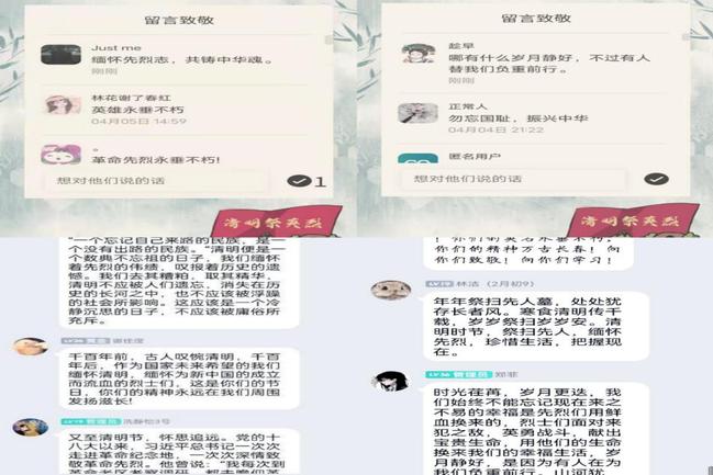各团支部组织学生通过校官网、学习强国等线上平台认真学习英烈事迹,并进入清溪茶苑微信公众号云祭扫平台开展线上云祭扫活动,以点亮蜡烛、敬献鲜花、云端追思等方式共同缅怀革命先烈,并就新时代如何传承先烈精神等话题进行讨论。