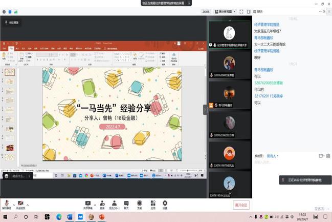 为加深同学们对“一‘马’当先”知识竞赛的了解,提高同学们的参赛热情。4月7日晚,安溪茶学院于线上组织开展“一‘马’当先”知识竞赛主题经验分享会。经济管理学院2018级金融学专业的曾艳受邀分享经验,学院共250名学生参加分享会。