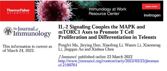 T细胞是适应性免疫系统的重要组成部分,在抵御病原入侵、抗肿瘤免疫、免疫记忆、协助B细胞产生抗体、调控其他免疫细胞活性等过程均发挥重要作用。T细胞的活化与分化过程受是TCR信号、共刺激信号、能量代谢信号以及细胞因子等的精密调控,其中细胞因子在调节T细胞的发育、成熟、活化、分化、记忆性T细胞的产生等方面均发挥重要作用。IL-2是一个多效性细胞因子,在调节T细胞增殖、分化与功能过程中发挥重要作用。目前哺乳动物IL-2调节T细胞免疫应答的功能及机制研究得较为清楚,但有关鱼类IL-2在调节T细胞免疫中的功能及调控机制仍知之甚少。近日,我校海洋学院陈新华团队的研究揭示了大黄鱼IL-2调控T细胞免疫的机制。研究结果以题为“IL-2 signaling couples the MAPK and mTORC1 axes to promoteT cell proliferation and differentiation in teleosts”的论文发表于美国免疫学家协会的旗舰期刊The Journal of Immunology(TOP期刊)。