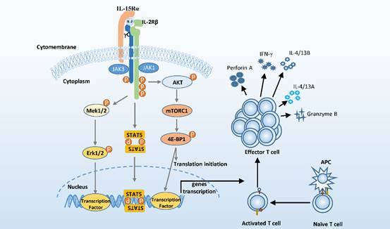 研究结果显示,大黄鱼IL-2在体内和体外均可促进T细胞增殖,并且促进CD4+ T细胞向Th1、Th2和Treg方向分化,抑制其向Th17方向分化,同时还可促进CD8+ T细胞成熟分化。利用特异性抑制剂抑制体内IL-2表达后,发现大黄鱼血液、头肾和脾脏等组织中T细胞增殖显著受到抑制,且在变形假单胞菌(Pseudomonas plecoglossicida)感染后的存活率明显降低,体内存留的变形假单胞菌数目显著高于对照组。活体过表达IL-2后,大黄鱼受变形假单胞菌感染后的存活率显著提高,体内存留的变形假单胞菌数目显著低于对照组和抑制剂处理组。研究发现,大黄鱼IL-2可与LcIL-15Rα和LcIL-2Rβ结合形成LcIL-2/LcIL-15Rα/LcIL-2Rβ复合物,进而招募LcγC形成cIL-2/LcIL-15Rα/LcIL-2Rβ/LcγC信号转导复合物,从而激活下游JAK-STAT5信号通路,活化后的STAT5进而促进T细胞释放与增殖分化相关细胞因子来促进T细胞的活化、增强T细胞的功能。此外,还发现大黄鱼IL-2还可以通过激活MAPK和mTORC1信号通路来调控T细胞功能。由于MAPK和mTORC1也是TCR下游重要的信号通路。因此,我们认为,细胞因子信号和TCR信号共同调节T细胞免疫应答是一种古老的策略,可确保机体产生适当的T细胞免疫应答。我们的结果为认识鱼类T细胞免疫应答的调控机制提供了新的证据。