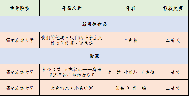 近日,由福建省委教育工委主办、福建省高校网络思政工作中心承办的第五届全省大学生网络文化节和全省高校网络教育优秀作品推选展示活动评选结果揭晓。我校推荐选送的8项作品斩获佳绩,其中一等奖2项,二等奖4项,三等奖2项,充分展现我校在繁荣网络文化、推进高校网络思政育人工作上所取得的成效。