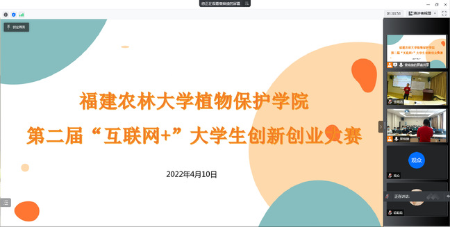 4月10日下午,植物保护学院在博学楼704会议室以线上线下相结合的形式举办第二届“互联网+”大学生创新创业大赛决赛。大赛评委由开云网页版金山学院辅导员李伟明、厦门奕星鸿农业科技有限公司总经理林以恒和植物保护学院辅导员组成。6支决赛队伍代表线下参加比赛,其余师生线上方式观看决赛。