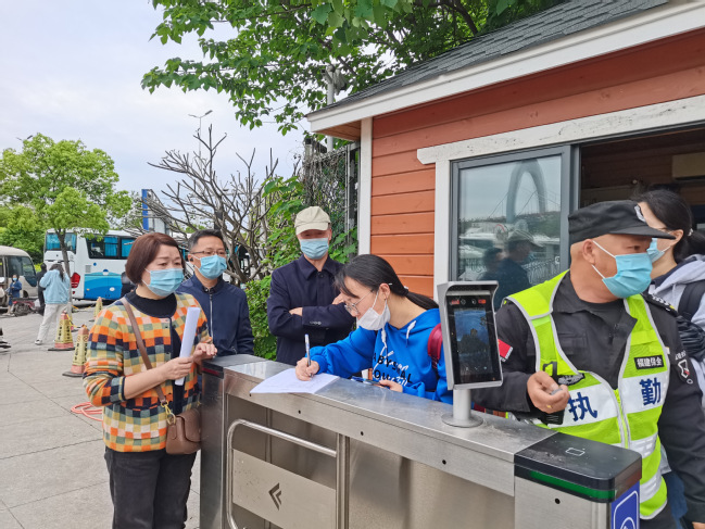 学院领导范焕谦、黄顺容在金山校区西门查看学生出校情况