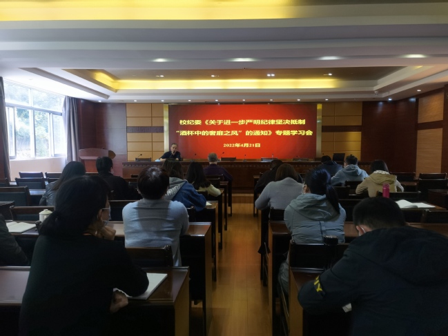 4月21日下午,继续教育学院纪委传达校纪委《关于进一步严明纪律坚决抵制“酒杯中的奢靡之风”的通知》文件精神。学院全体教职工参加,院纪委书记吴鹏程主持学习会。