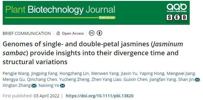 近日,我校园艺学院叶乃兴教授团队联合中国农业科学院农业基因组研究所张兴坦研究员在国际植物学著名期刊Plant Biotechnology Journal(中科院TOP期刊,IF=9.8)发布福州长乐种‘福州单瓣茉莉花’与全国主栽种‘双瓣茉莉花’的高质量基因组,并且结合已发布的多瓣茉莉基因组数据,揭示不同瓣型茉莉花的分化与结构变异,填补了福州单瓣和双瓣茉莉花基因组学研究的空白。该结果为茉莉花的功能基因组学和遗传育种研究提供了宝贵的资源,也为茉莉花的产业化和标准化奠定基础。