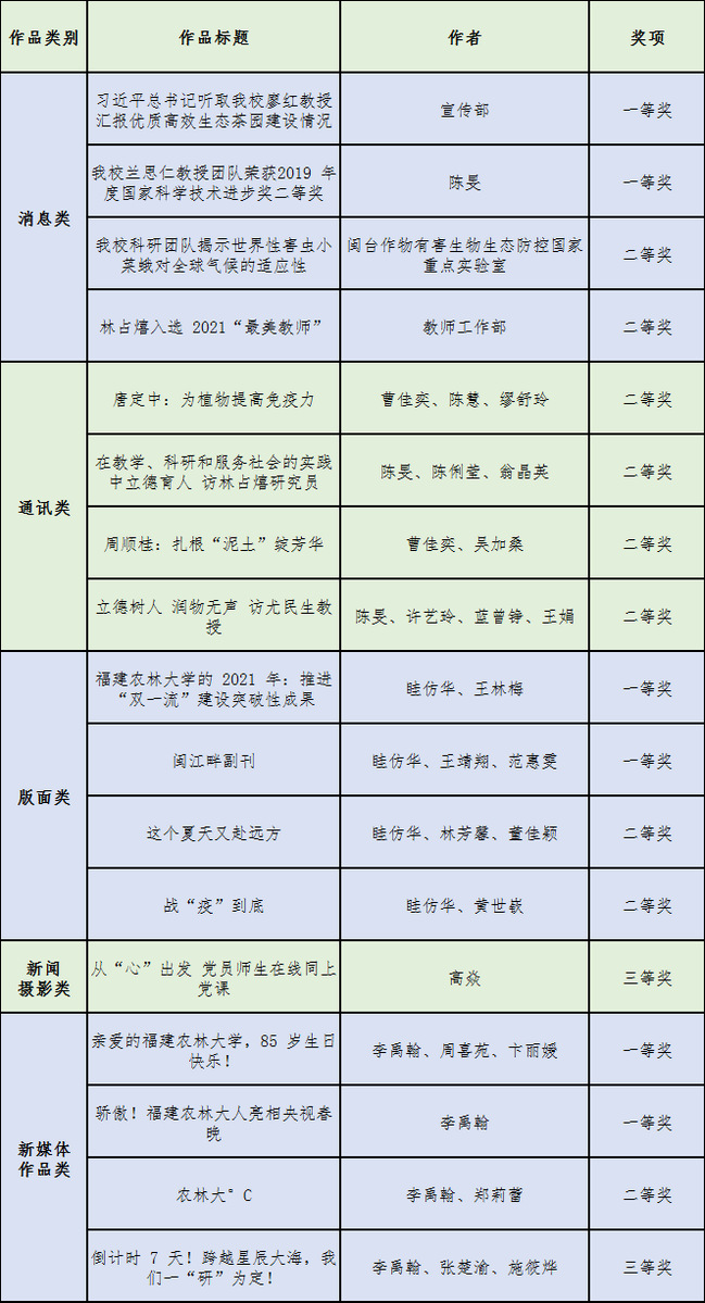 近日,2020-2021年度福建省高校好新闻评选结果公布,我校选送的17件作品从全省各高校报送的众多作品中脱颖而出,获得一等奖6项、二等奖9项、三等奖2项,获奖数量和质量均创历年新高。