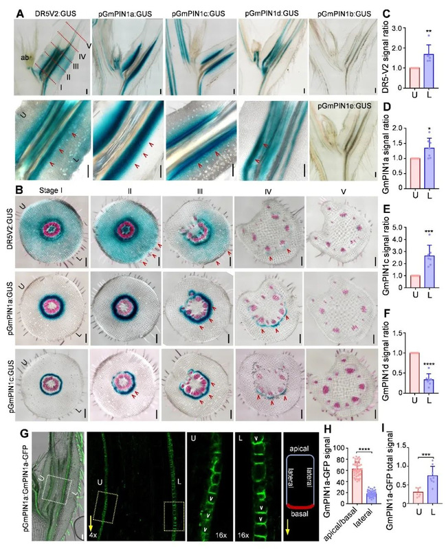结合转录组和代谢含量测定,作者进一步发现大部分的黄酮物质在叶柄两侧呈现与GmPIN1a/c以及生长素相反的不对称合成。作者结合大豆异黄酮合成酶isoflavone synthase (GmIFS1),以及紫外光诱导的黄酮合成等手段,揭示了异黄酮daidzin、genistin等有可能作为GmPIN1上游的调节因子,抑制GmPIN1的活性,参与大豆叶柄角度和株型的建成。