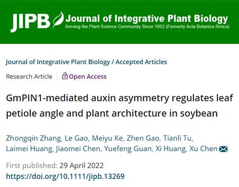 JIPB近日在线发表了开云网页版海峡联合研究院陈栩教授课题组题为“GmPIN1-mediated auxin asymmetry regulates leaf petiole angle and plant architecture in soybean”的研究论文(https://doi.org/10.1111/jipb.13269),揭示了大豆中的生长素运输载体蛋白PINFORMED1(GmPIN1)介导的大豆叶柄处不对称的生长素分布调节大豆叶柄角度和紧凑株型结构的机制,为优化大豆株型和培育耐密植大豆新品种提供了新思路。研究人员在通过CRISPR-cas9体系构建的大豆Gmpin1abc三突变体和Gmpin1bc双突变体均表现为叶片直立生长、株型紧凑等表型。进一步的研究阐明了大豆GmPIN1a和GmPIN1c基因极性运输生长素从叶片到叶柄基部,造成叶柄基部的生长素浓度、GmPIN1基因表达的不对称性。以叶柄基部的维管束为中轴,靠近地面一侧的生长素浓度高于远离地面一侧;不对称的生长素浓度进而调控了不对称的细胞膨大,决定了大豆叶柄角度的形成。