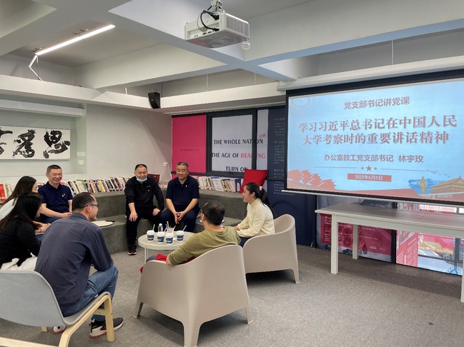 党支部书记林宇玫还就习近平总书记在中国人民大学考察时的重要讲话精神进行详细的解读。她表示,习近平总书记在中国人民大学考察时强调“要坚持党的领导,落实立德树人根本任务,传承红色基因,扎根中国大地办大学,走出一条建设中国特色、世界一流大学的新路”,这是对我们作为教育工作者提出的工作要求与行动指南,我们要深刻领会、贯彻落实习近平总书记的重要讲话精神,牢记“为谁培养人、培养什么人、怎样培养人”的根本问题,要求每位党员同志要进一步做好教辅工作,全心全意服务学院师生,为学院的教育教学、人才培养等工作贡献力量。