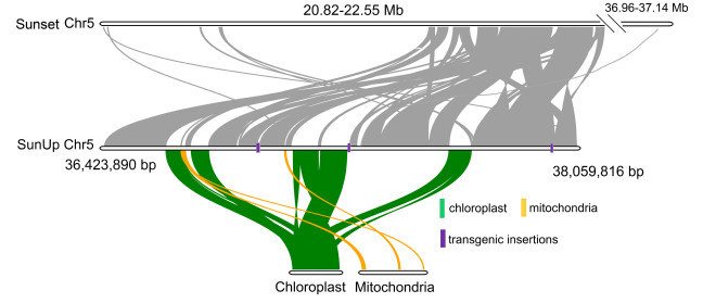图2. SunUp 5号染色体上的 1.6Mb 插入片段来源分布图