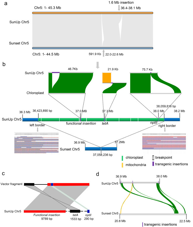 (a)SunUp和Sunset 5号染色体的共线性比对;(b)SunUp 1.6 Mb的片段插入在Sunset 5号染色体上;(c)三个转基因片段在质粒上的位置与在1.6 Mb插入片段上的位置对比;(d)三个转基因片段的6个侧翼片段在SunUp和Sunset中的比对。